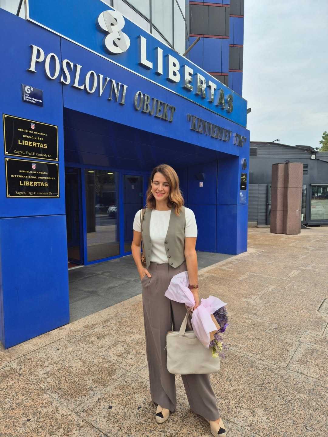 Za ovu prigodu, lijepa Zadranka birala je poslovni look koji se sastojao od širokih hlača, obične bijele kratke majice i prsluka.