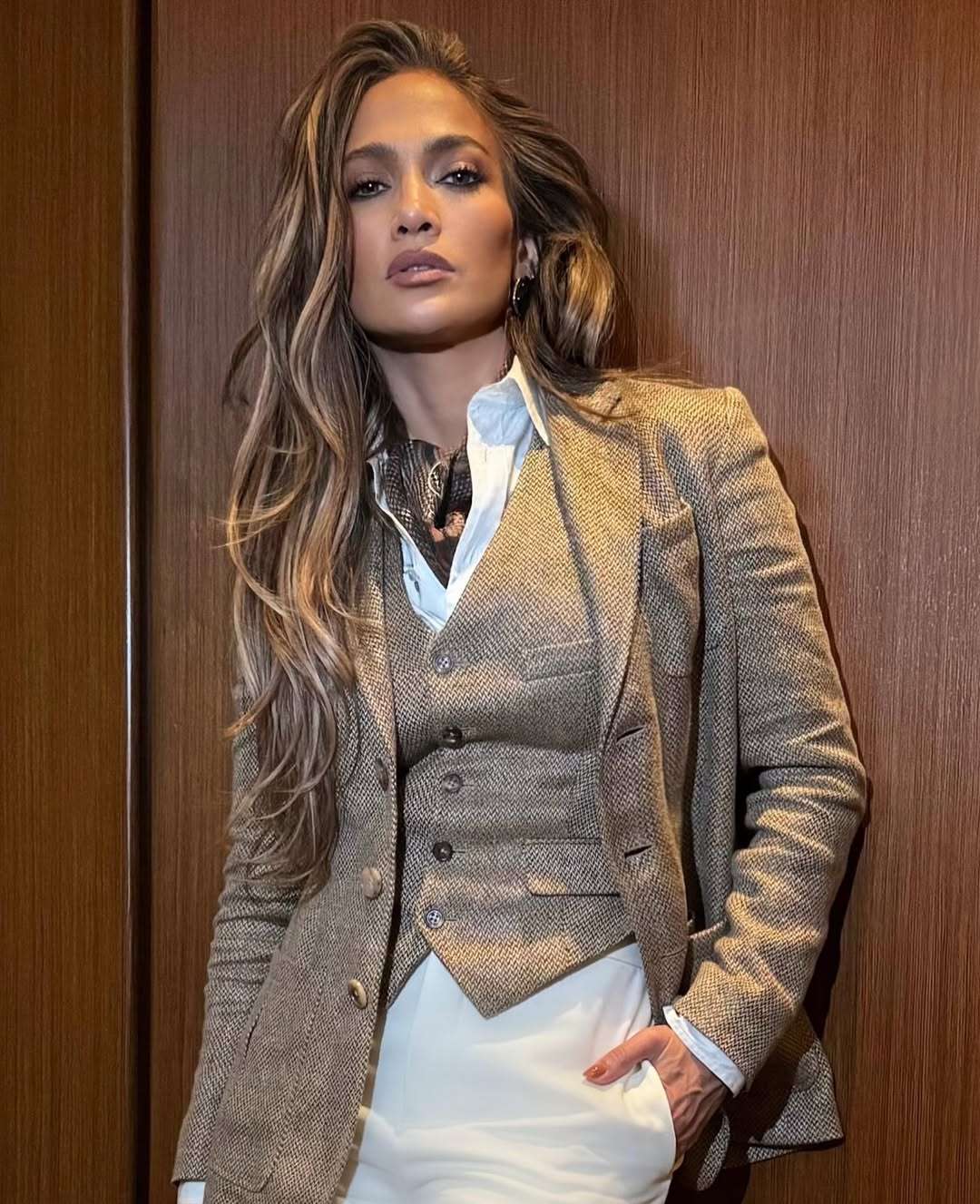 Umjesto klasičnog ‘J.Lo glamura’ na koji smo navikli, odlučila se za elegantan i profinjen look u poslovnom tonu, trodijelno odijelo u toplim bež nijansama i široke bijele hlače. Ipak, i u ovom suzdržanijem izdanju, seksepil i samouvjerenost zračili su iz svakog detalja.