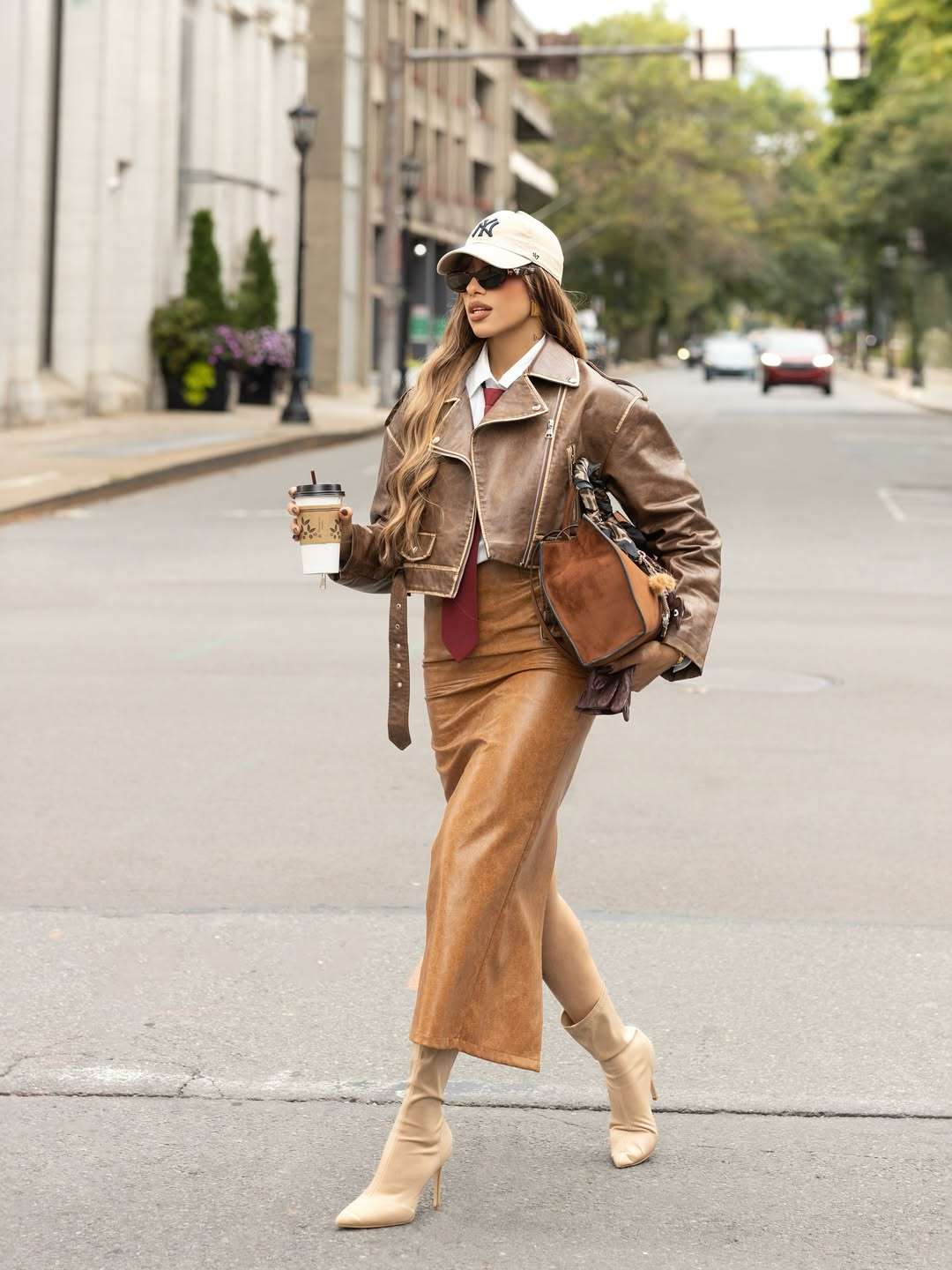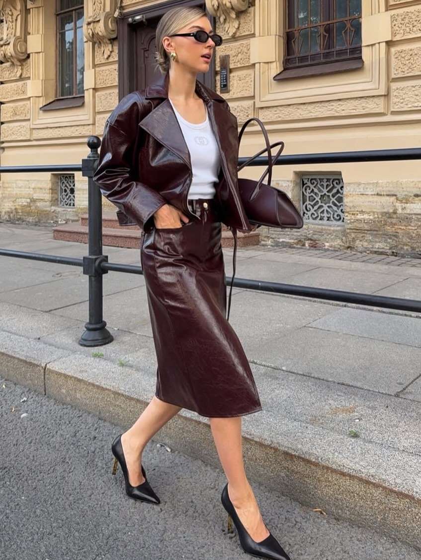 Street style scene posljednjih tjedana prepune su kombinacija s kožnatim suknjama, od minimalističkih outfita s bijelim košuljama i salonkama do hrabrijih modnih igri u stilu 90-ih s kratkim majicama, chunky nakitom i oversized jaknama.