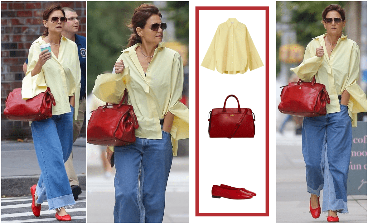 Katie Holmes prkosi jesenskoj monotoniji! Kombinacijom žute košulje i crvenih detalja pokazala da i hladniji dani mogu izgledat razigrano